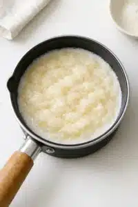 Next, warm the bloomed mixture over medium-low heat. Add the sugar and chopped milk chocolate and whisk slowly as the chocolate softens. Keep the heat gentle and avoid boiling. Tiny bubbles around the edge are your cue to lower the heat. Boiling can weaken gelatin and may cause coconut milk to separate.