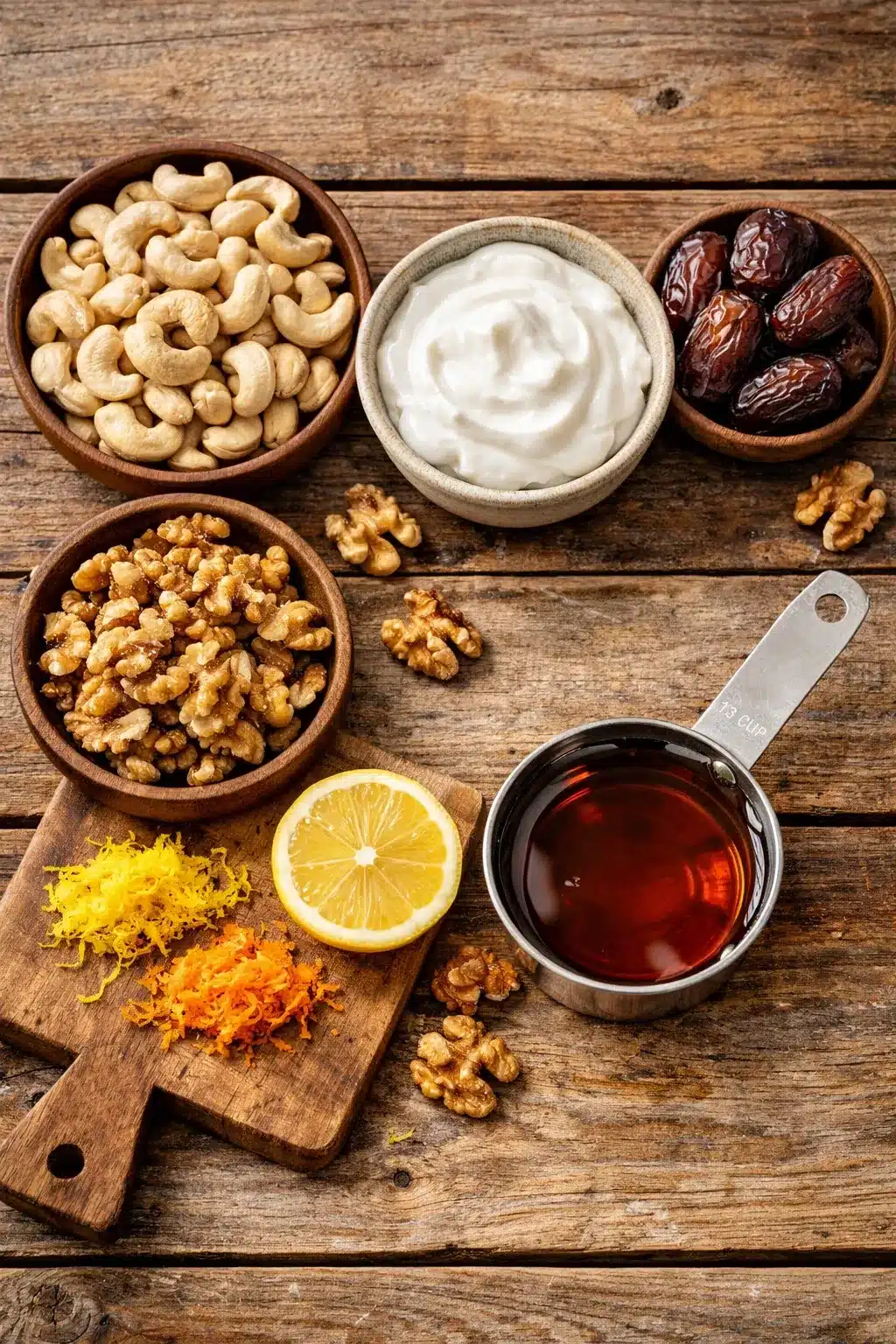Sturdy, dry biscuits or a date-walnut crust are ideal. The crust here uses medjool dates and raw walnuts, which compact and hold moisture slowly, so the filling sets without the base dissolving too quickly. If you prefer a cookie base, choose firmer cookies like plain digestive, graham-style, or even Biscoff for a spiced twist; for a guide to cookie choices and structure, read the best cookies for yogurt cheesecake.